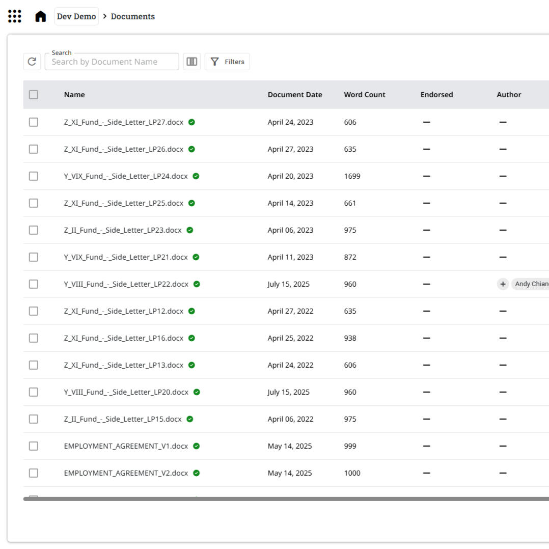 Upload all your side letters, LPAs, and fund documents into one centralized, secure location. Our software automatically extracts terms to make every document instantly searchable. Find any clause, commitment, or investor term in seconds using natural language descriptions or advanced filters. Your entire document library becomes a powerful, organized knowledge base that grows smarter over time.